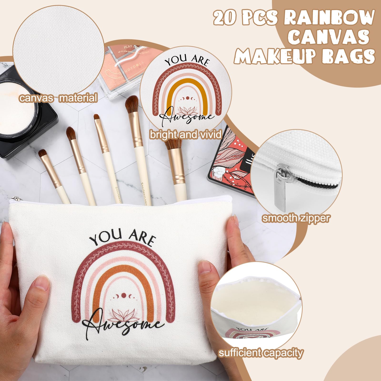 - Fashionable and Inspirational Combination: you'll get 20 pieces of canvas cosmetic bags and 20 pieces of key chains with different rainbow graphics and various motivational texts to brighten up your day and keep your essentials organized
